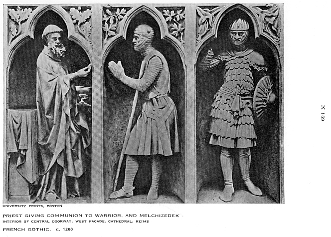 At the Cathedral of Reims, France, built in the mid-13th century, a carving that may represent Melchizedek and Abraham. It is also said to represent a priest serving Holy Communion to a warrior.